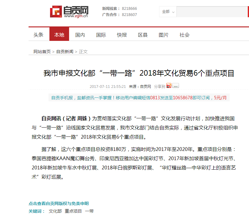 為落實“一帶一路”國家戰(zhàn)略,呼應國家、省、市“一帶一路”重大倡議目標,我公司以“絲路之燈東方來”為主線積極拓展境外市場。目前公司新加坡、俄羅斯兩個燈展項目,被自貢文化部門推薦入錄國家文化部“一帶一路”2018年文化貿(mào)易重點項目申報庫。自貢市上報的文化貿(mào)易重點項目共計6個。