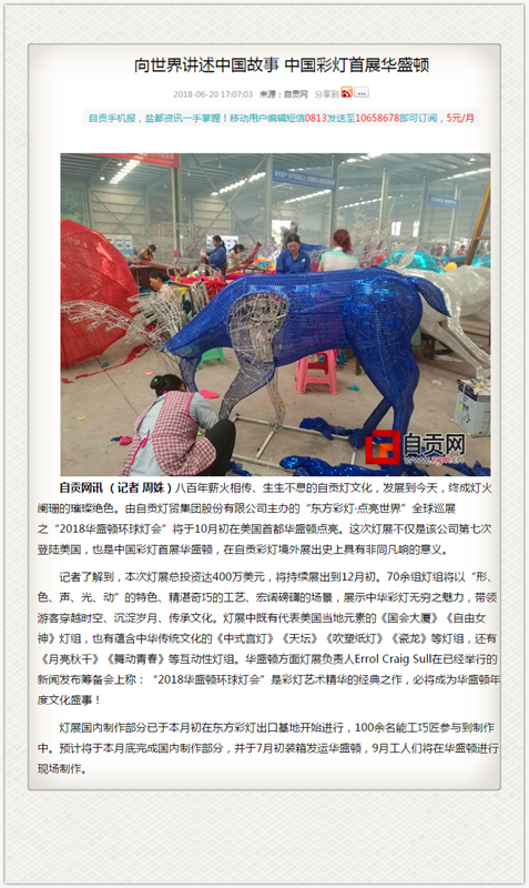 “2018華盛頓環(huán)球燈會(huì)”是東方彩燈第七次登陸美國(guó),也是中國(guó)彩燈首展美國(guó)政治中心——華盛頓,受到各界廣泛關(guān)注。近日,《四川日?qǐng)?bào)》、《自貢日?qǐng)?bào)》等多家官方媒體對(duì)本次燈展做了專(zhuān)題報(bào)道。