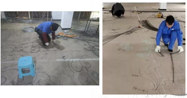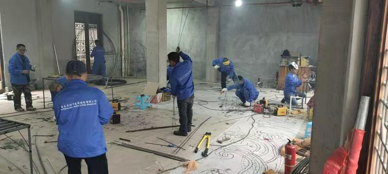 看,來(lái)自東方彩燈的工匠們正在放樣、造型,按照效果圖,在地面上描一幅放大的勾線圖,然后將一根根鐵絲用鉗子扭成一段段彎曲的線條,把平面圖變成一幅由實(shí)體材料組成的框架。