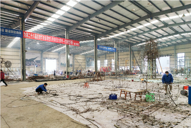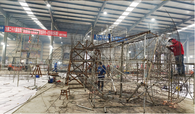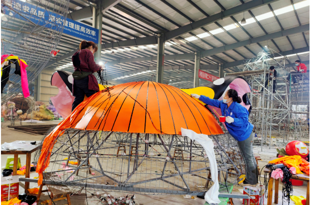 走進燈貿(mào)集團生產(chǎn)現(xiàn)場,呈現(xiàn)眼前的是一篇繁忙景象。近200名東方彩燈的工匠按照放樣、造型、噴涂、電器安裝、裱糊、美術(shù)處理等生產(chǎn)流程,井然有序、熱火朝天地開展生產(chǎn)。但見,造型師焊槍焰火、飛火流星;電器師神工妙力,串接璀璨;裱糊師巧奪天工,斑斕溢彩;美術(shù)師鬼斧神工,爐火純青......