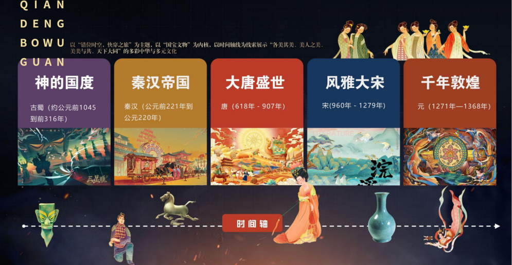 自貢燈貿(mào)集團承制的第29屆自貢國際恐龍燈會《千燈博物館》燈組以“錯位時空,快穿之旅”為主題,以“國寶文物”為內(nèi)核,以時間軸為線索展示“各美其美、美人之美、美美與共、天下大同”的多彩中華與多元文化。用故事化、場景式的方式讓游客體驗文物背后的文化,仿佛身臨文物當年的時代。